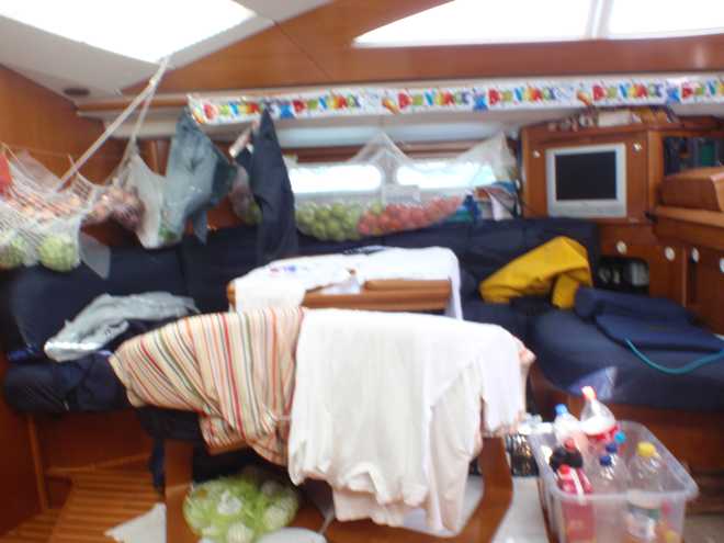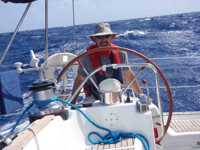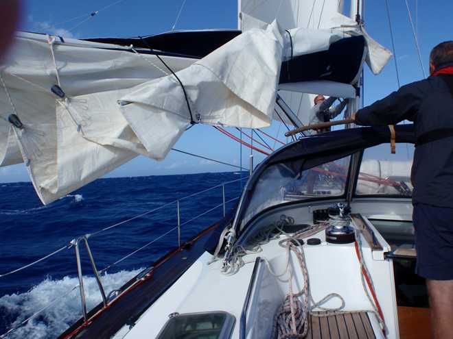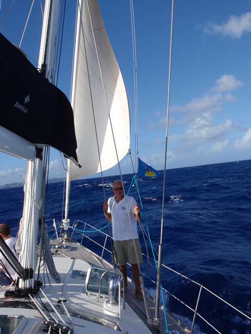 This morning although fairly uneventful has kept us entertained. The early hours were spent avoiding this weather bouy to the north east of Barbados, although we had a position for it, we were mindful that the ocean at that point is over 5000m deep and the buoy probably had a good amount of slack so gave it a couple of miles berth and in the end didn’t even see it….so much for the guaranteed fish!! Just after we were joined on the scene by a 700ft tanker heading westwards to one of the islands, our AIS system said that he’d pass within 2 miles of us so called him up just to check he’d seen us. Quite a happy chappy at that time in the morning, and yes he had both seen us on the radar and also visually and he was happy with the distance……even at 2 miles we were dwarfed by the superstructure and it wasn’t even one of the really big ones that we’ve seen on our crossing.