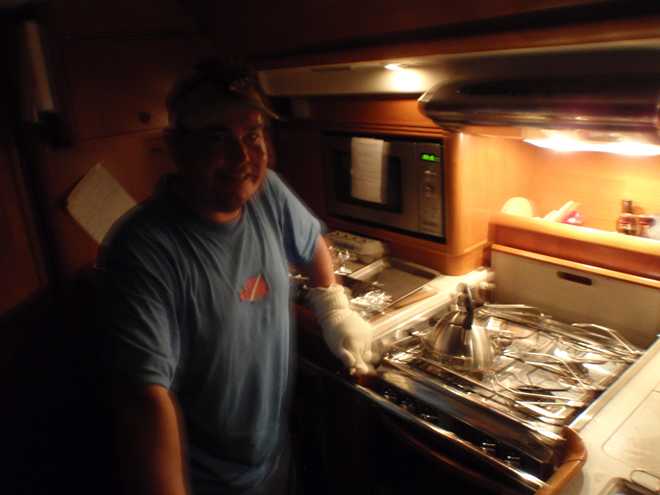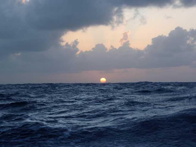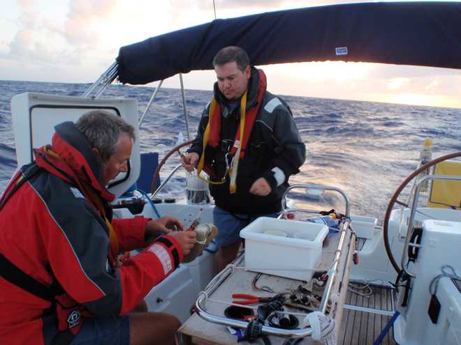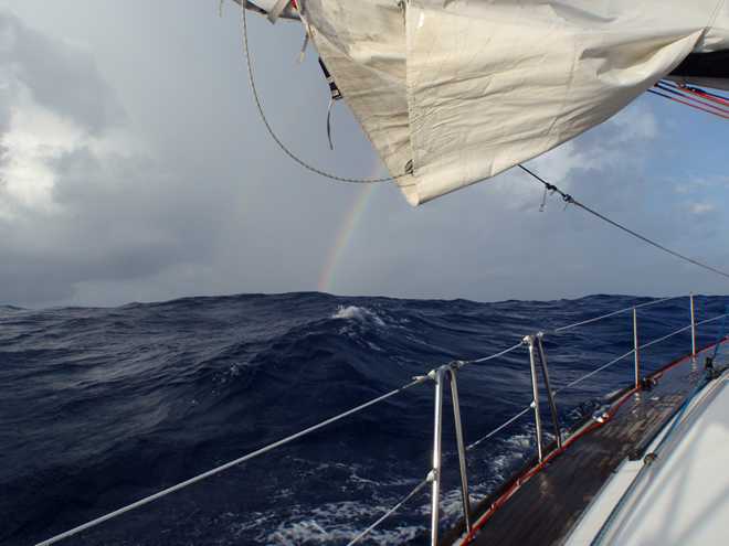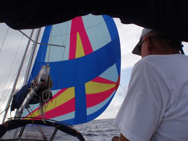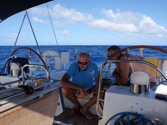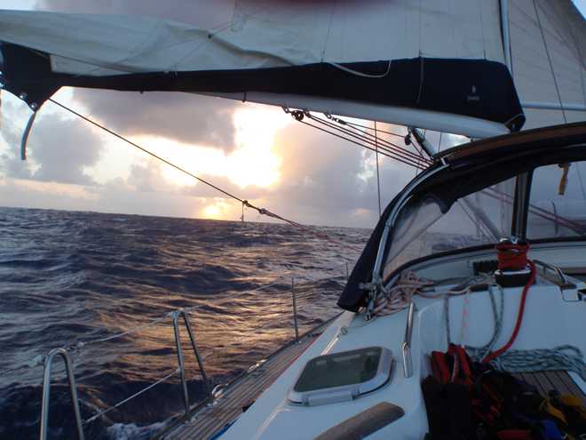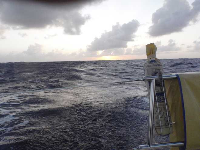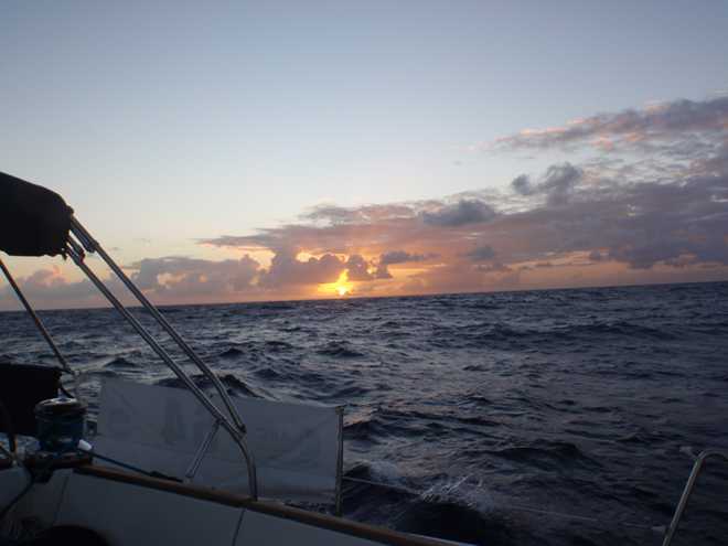 Well they do say if it can happen, it will and this morning was certainly the case! After days of sailing downwind in cloudless and hot days, we finally had the opportunity to put up the bimini and give the crew some respite from the constant searing heat and what does the weather go and do…..yes, you’ve guessed it. It has clouded over and started raining!!!!!! Oh well, we can’t complain as it is more than welcome as the sun rises at around 5:30 and by 7 is already burning you until it disappears over the horizon around 5ish. Speaking of sunrises, we have been treated to some spectacular ones, the first you notice is that the darkness is slowly replaced by a fantastic shade of blue before you actually see the sun creep above the eastern horizon, certainly an impressive sight as you suddenly have light over the wildness that you have experienced blindly for the past 12 hours.