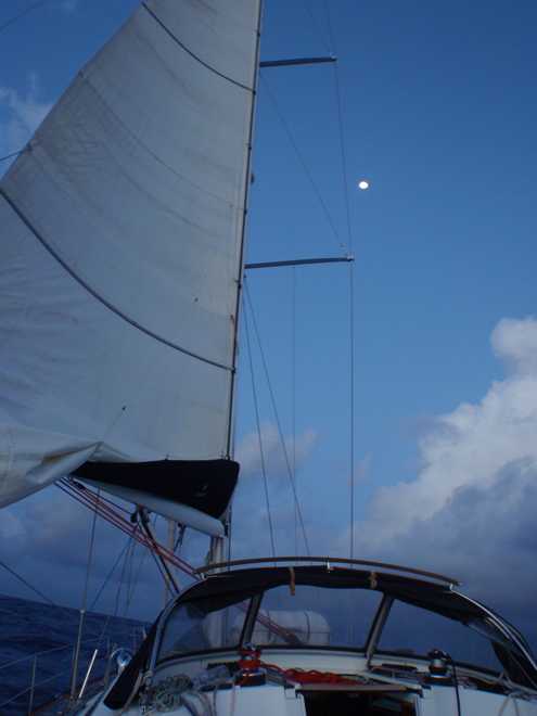 Earlier in the night, Tioram had engaged in a spot of tactical racing with another competitor (well we presumed that they were in the ARC), gybing down the rhum line. Well it wasn’t really tactical on our part as we were trying to stay dry and avoid a very large squall that could have dampened the mood, literally! In the end, we managed to bear away onto a heading straight down the rhum line to St Lucia, whilst our adversary was forced to gybe away and head north, but why he headed so far north still has us perplexed.