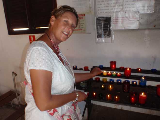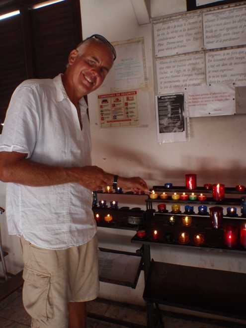 Les Saintes is like a small Bequia (Grenadines), which reminds us of Salcombe again. A large horseshoe bay very like an estuary. Lots of nice houses, very French colonial , very French church, very beautiful but feeling European, not Caribbean. In the church we found candles to buy which is still so nice, often churches now only have fake candle lights. We both lit candles for loved ones lost, Tony’s Mom and Dad, my grand parents, my sister and my uncle.