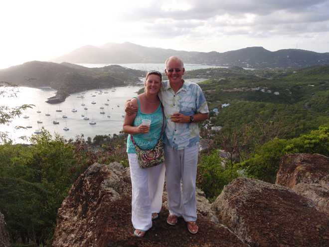 It is a really stunning view of both the English and Falmouth Harbours ( or natural inlets ) and traditionally a view point to watch the sunset. We arrived early as the sun sets around 6.30-7pm here at the moment. So at 5pm we sipped our rum punches listened to the great steel band and marveled at the view with little Tioram sitting stern to the dock way below us. I have to say it bought a few tears to my eyes to think how many miles she had sailed through seas and oceans to be there and how many years we had waited for the view.