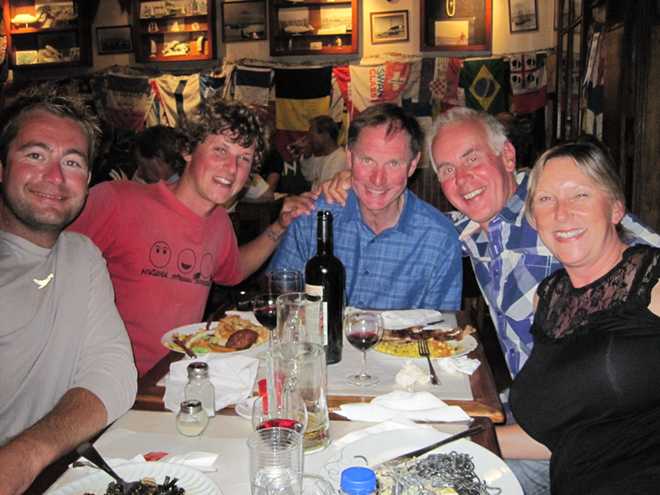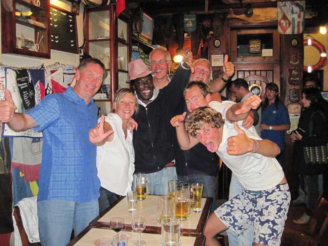 Photos below—-first night 27th in Peter’s bar /meeting Open 60 crew, Pete and Vernon.