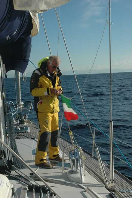 So the motor went back on motor sailing and we were heading for Sardinia again. At 1300 hrs the wind finally backed to north easterly as predicted — so the motor went off, full sails up and away we went. The wind increased to 22 knots and for the rest of the day we were flying with one reef in the main (reduced the size of the large sail) and genoa (forward sail ).