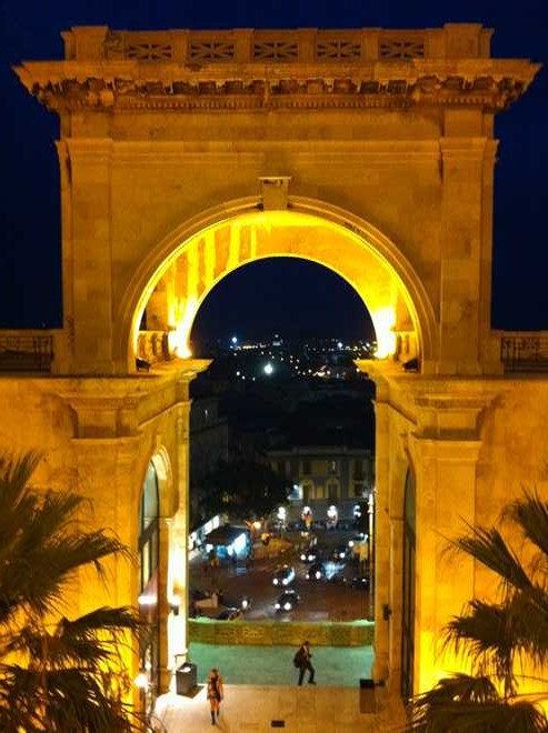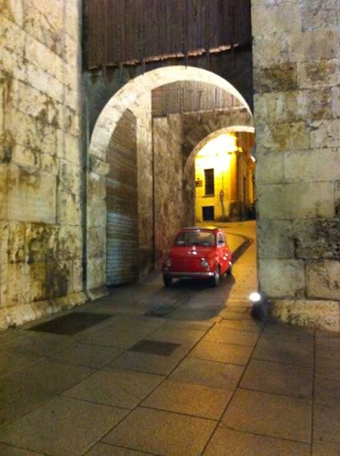 *Fiat 500, — original 60’s cult car drives through one of the narrow tower gate entrances to the old town.