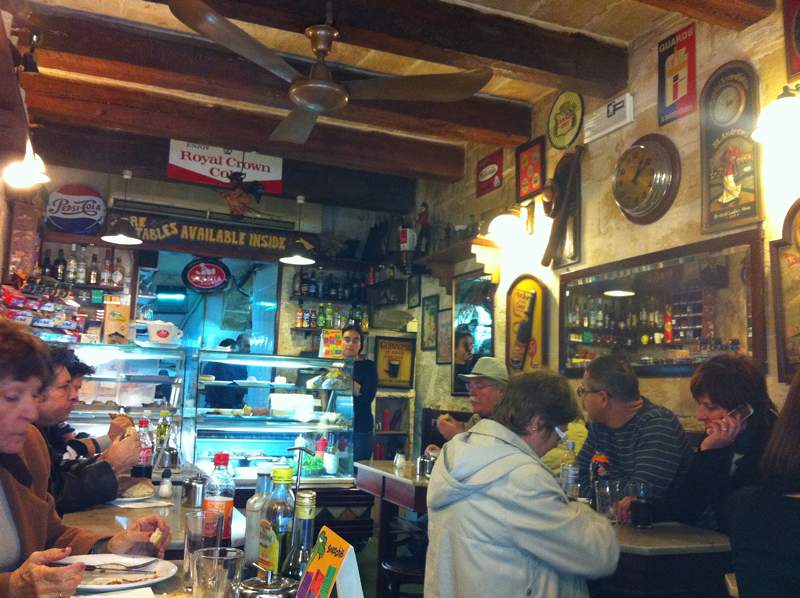 There is a wonderful little cafe in Valletta where I am now sitting. It is tiny about fourteen feet wide by forty feet long, the interior filled with memorabilia on stone walls and wooden ceiling beams and tiled floor. The tiny high legged tables run in lines along each side of the cafe are a mere two and half by one and half feet allowing two people to just about squeeze together on one table to eat.