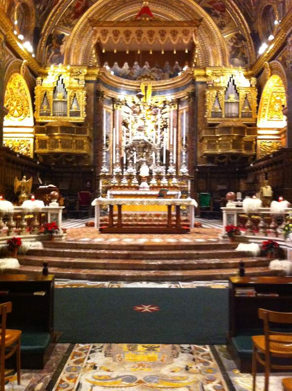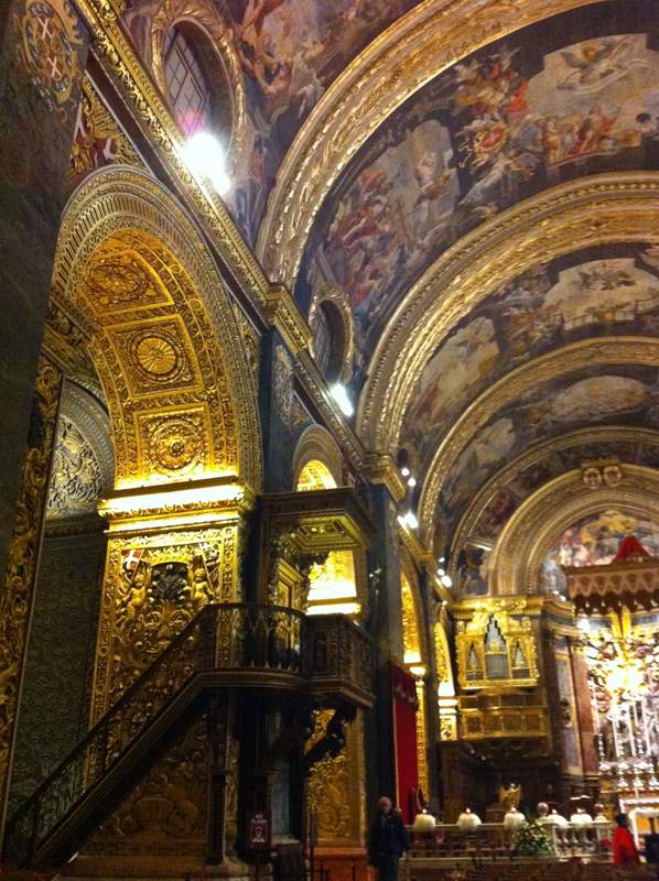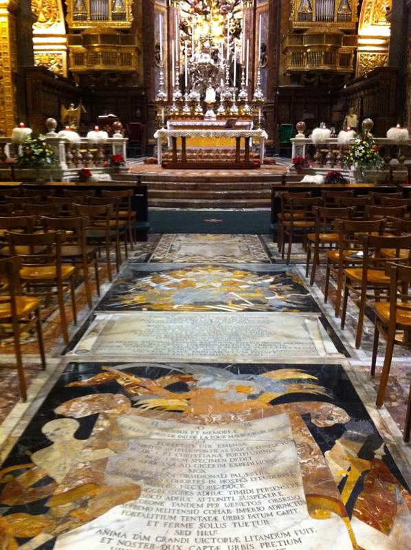 Every inch of the interior feels to be decorated and embellished with ornate and often symbolic decoration and monuments. Marble, gilt, frescos, Caravaggio paintings, pure silver and even the floor is covered with 400 decorative tombstones in memory of aristocrats of the Order of St John.