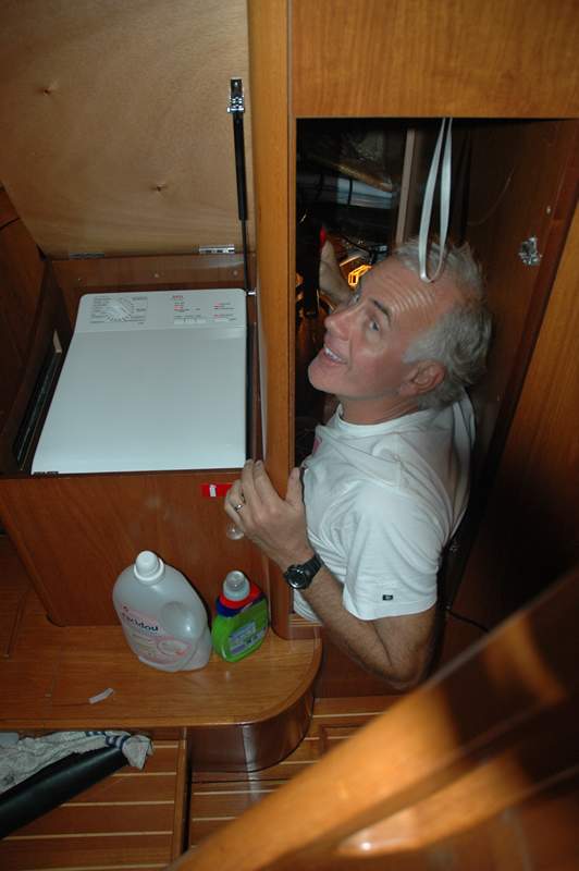 Tony is literally now in his element, head in lockers, bilges, as you do, fixing, installing and maintaining things.