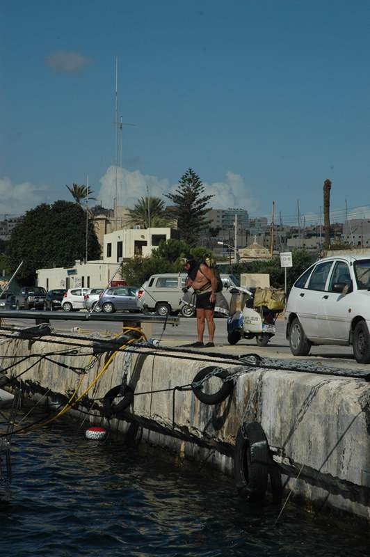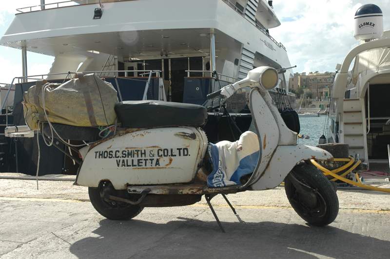 in a 1950’s style text painted on it. The old scooter was certainly vintage and sadly rusting badly, especially where the rider would put his feet,a little tricky you might think on Maltese roads. The rear ‘luggage’ rest had been adapted to carry a wooden crate which held a sack- like bag and seemed to hold tools. It was parked at the rear of a boat.