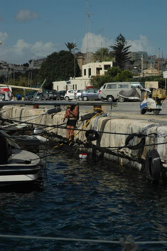 He wobbled to the waters edge and jumped off the wall into the water. 30 minutes later he returned after fitting a new mooring line to the sea bed for a neighbours winter stay.
