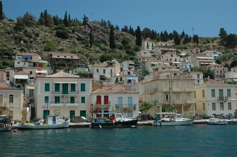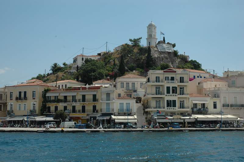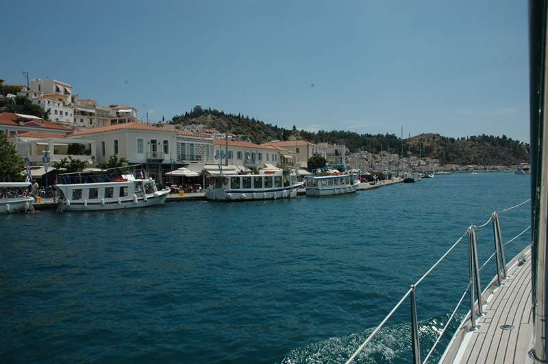 Poros town on Poros sits on a small volcanic peninsular and so forms a particularly nice venue for yachts. The town quay/waterfront is lined with lots of yachts who are stern to the cafes, bars and restaurants and the houses of the town stacked up on the hillside behind.