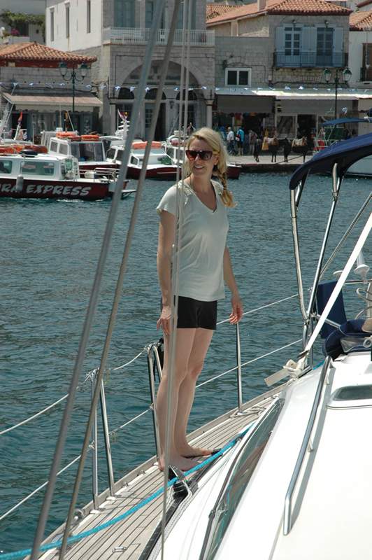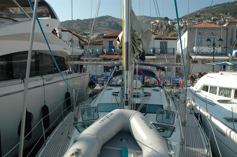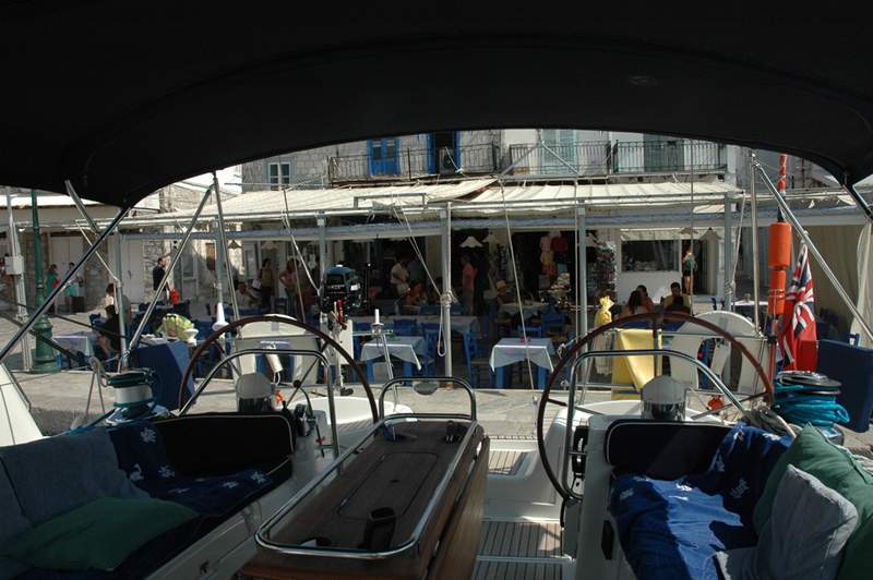For the first time we witnessed the ‘Greek’, mooring style of anchoring stern to—3 boats deep to the quay. Boats drop their anchors and reverse to the boat astern and tie their sterns to the bows of the boats behind. Then another line comes in.. crossed anchors and all ‘good’ fun when the wind gets up.