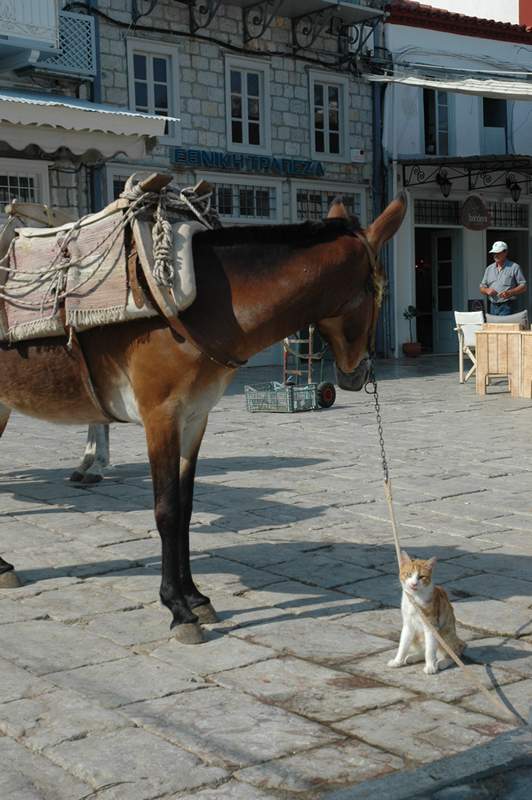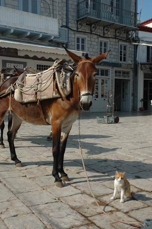 On the dock at Hydra, I saw one donkey gently nudge a cat with its leg ‘Greek style’— the cat was obliviously drinking some fresh water and getting tangled in the donkeys rope.