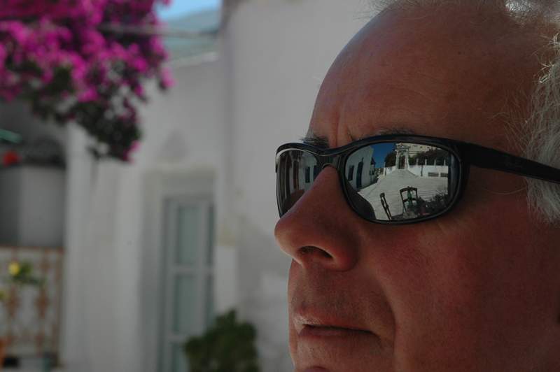 – Lefkas, Tiny taverna in the square, church, reflections of cafe life in Tony’s sunglasses, one way roads.