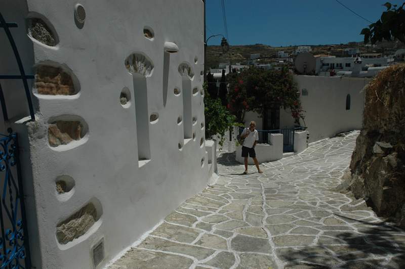 Outside of Paros town the island has simple low–rise development and even the main resorts are not over-commercialised. We visited Lefkas, the ancient capital which has retained it’s old ‘Greek’ styling. Even the small roads have one way arrows painted on the ground, see photos of the taverna, church and narrow streets.