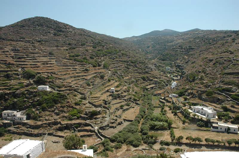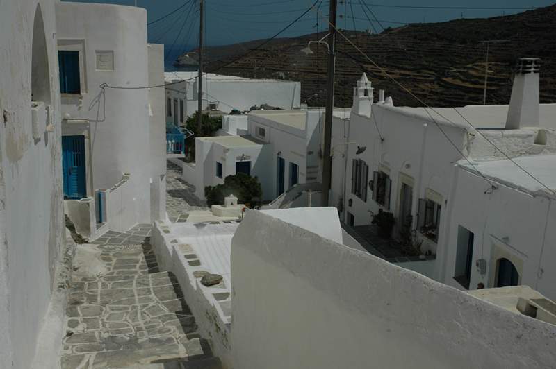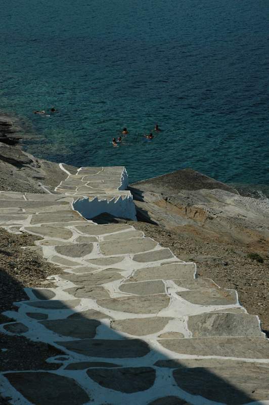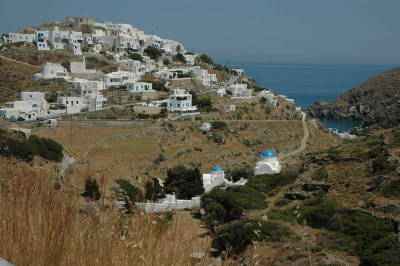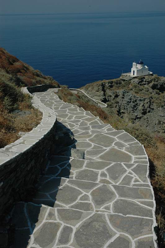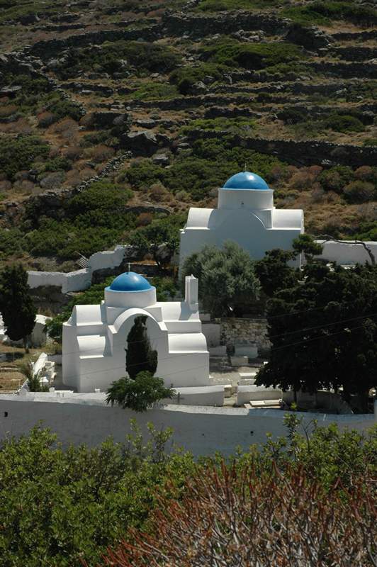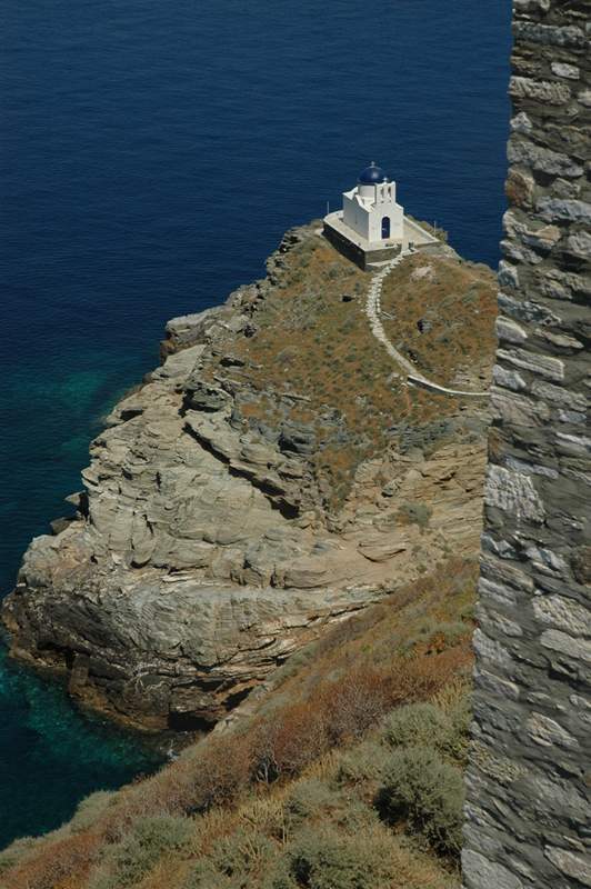 The views from the Kastro are great, the ancient walls and cliffs falling steeply on the one side to the sea and spectacular terraced hillsides to the other. On the sea side an outcrop is topped by a church with a white- washed pathway leading down to it—— not unlike the church in the ‘Mama Mia’ film. ( see photos )