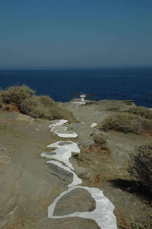 On the end of the rocks stands—what look’s like a font— next to an ancient ‘font’ carved in the rock. The white wash paint takes you on a journey to it. Another path leads down steps to the sea and to a gentleman’s motor yacht, called ‘Lord Byron’ which was anchored in the bay.