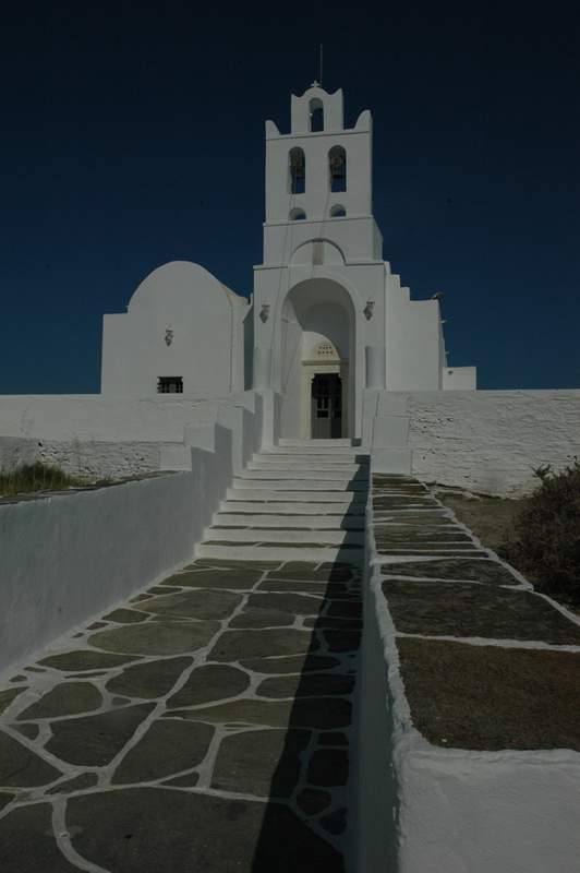 What a sight, the 300 year old church, only reached over a small bridge which links the outcrop of rock. The white- washed church, archetypal Greece with a white- washed path leading to it.