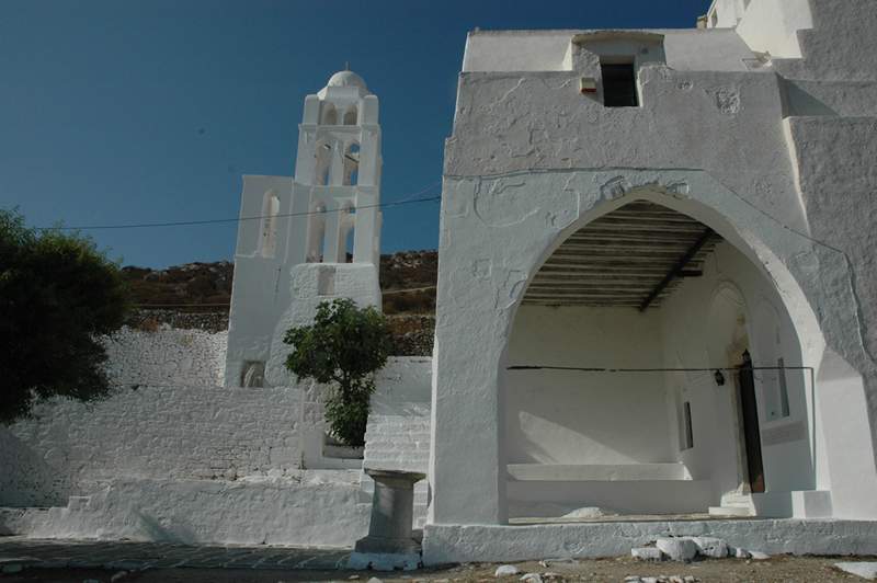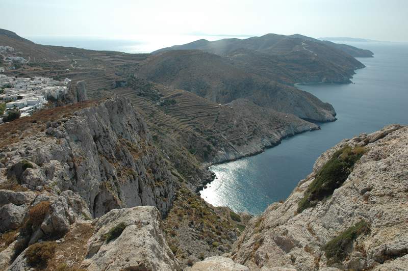 The church on the 300m high cliff and spectacular views of the island, the terracing and out to sea.