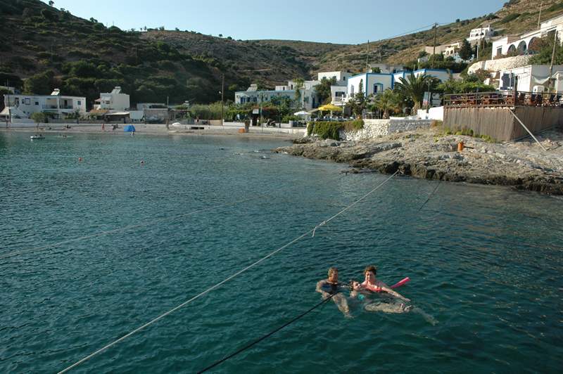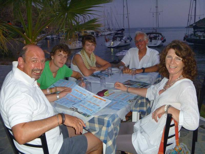 There is room for 3 or 4 yachts with sterns into the prevailing winds, the space astern creating a private swimming pool. Tony took Alex to the beach with his scuba gear and Alex was able to try diving in shallow water for the first time. Carol and Pat enjoyed some chill time sunbathing on deck, whilst Imogen and I had a fab time snorkelling and following fish, the most we had seen in the Aegean.