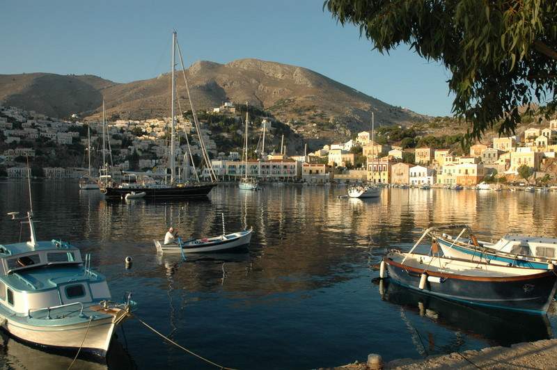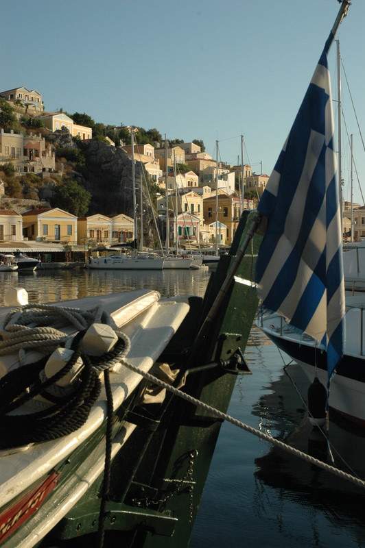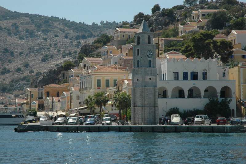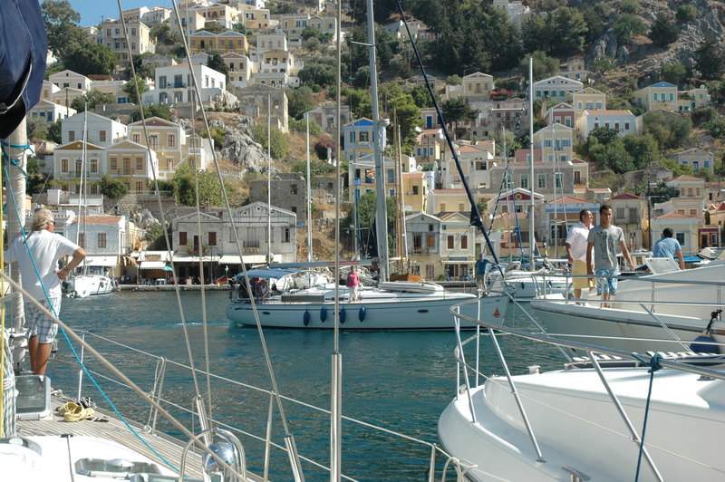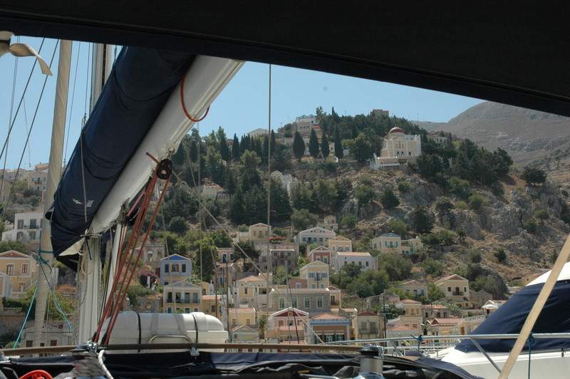 We motored the 25 N miles along the Turkish coast in no wind to the Island of Simi. As we approached the island we motored through the small 4 metre deep channel between Simi and the tiny rock island of Nismos.