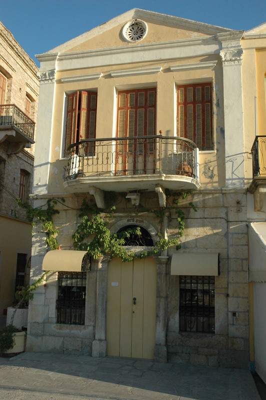 We motored into the harbour of Simi with its amphitheatre-like stacked up architecture. The Neo classical houses and churches are a stunning visual feast, with their flat fronted facades, projected balconies and floor to ceiling open windows. The facades, gables and doorways painted predominantly in soft mustard yellows with rose pinks, beige, turquoise and so on.