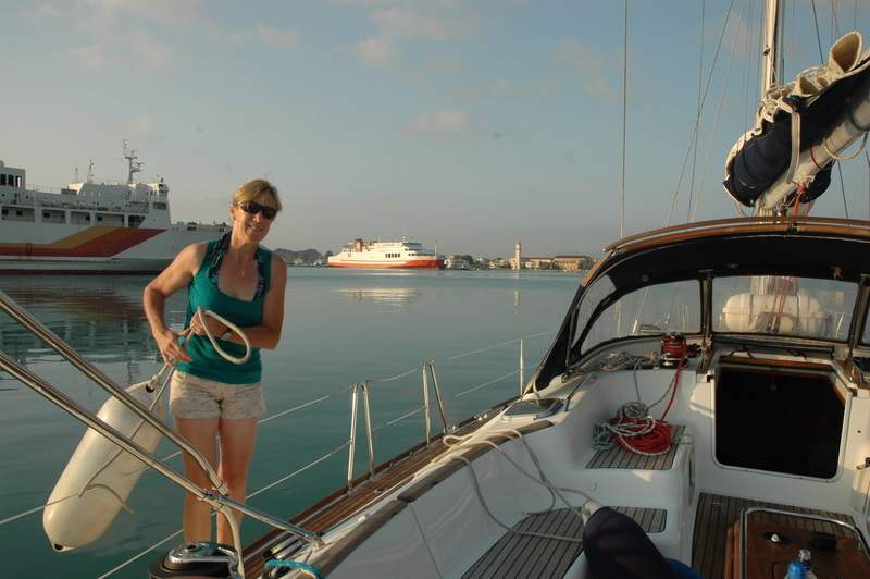 On 8th September Jackie, John, Tony and I slipped our lines and motored out of Zakinthos town harbour for Tioram to head West. We motored the first 26 n miles in 7 true knots of light wind with a fairly lumpy swell caused by the thunder storms and lightening the night before. We had delayed leaving due to the forecast for a possible force 6 with rain and had seen the lightening from the cosy harbour, where we missed the storm.