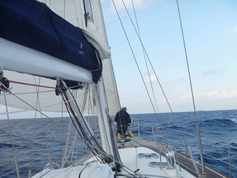 Tony immediately started retrieving the sail from the bow and the two of us worked together very quickly to recover the heavy wet sail from the sea before it fouled anything.