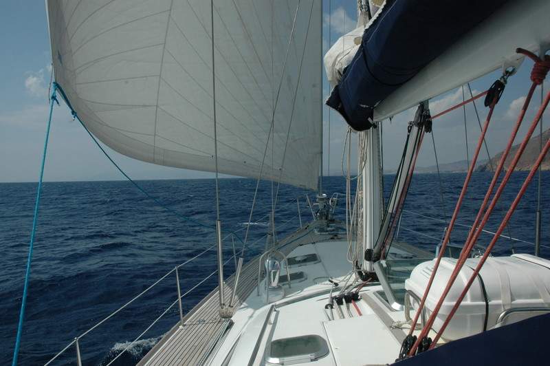 At mid day we put up the cruising chute, making good speed in light winds and a building rolly cross sea. After a couple of hours we decided to get the cruising chute sail down to check the halyard (rope to the top of mast ) for any chaff as we have had some minor problems before. We put Tioram onto auto pilot and Tony went to the bow to furl and retrieve the chute and I was readying the sheet (tensioned rope to the cockpit winch) when the halyard/rope at the top of the mast suddenly broke—- for a moment the sail seemed to hold in the air before falling to our starboard side in to the sea. I got the sheet (rope) on board quickly to ensure it didn’t go under the boat and foul the propeller or rudder.