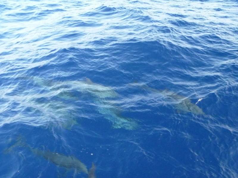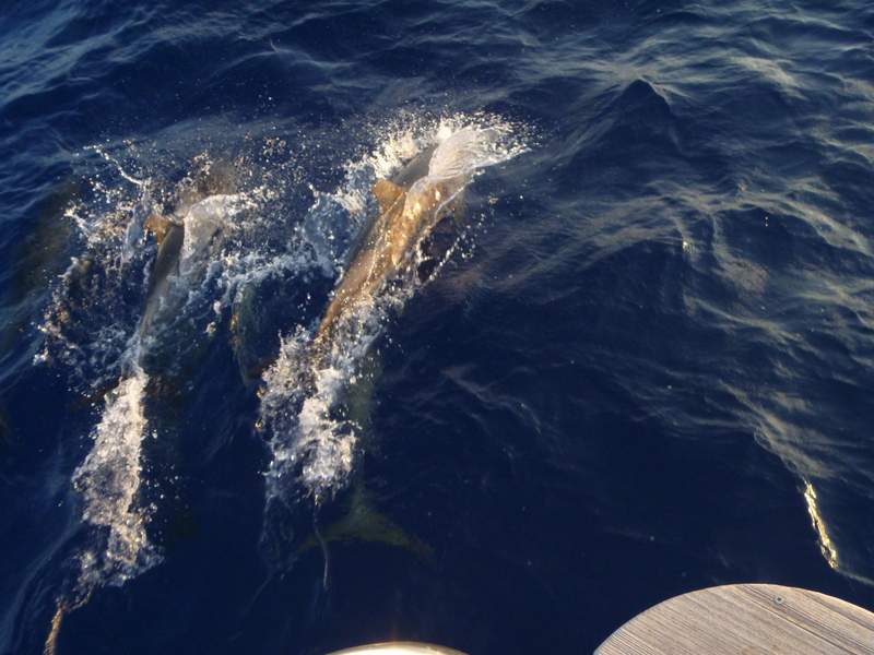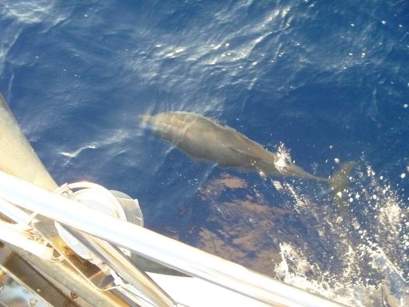 At 19.20 we were joined by 6 or 7 dolphins jumping vertically out of the water near our beam and then playing on the bow.