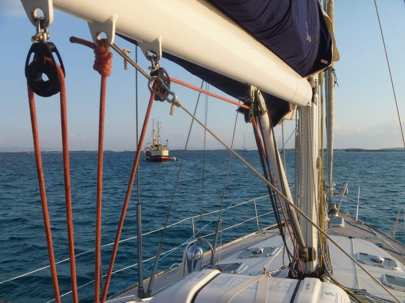 Before long the wet sail was safely stowed and we set a poled out genoa (forward) sail and mainsail arrangement. Our speed reduced considerably in the light winds to 4/5 knots until around 18.30 when we decided we couldn’t continue to make enough progress in the right direction and reluctantly put the engine on.