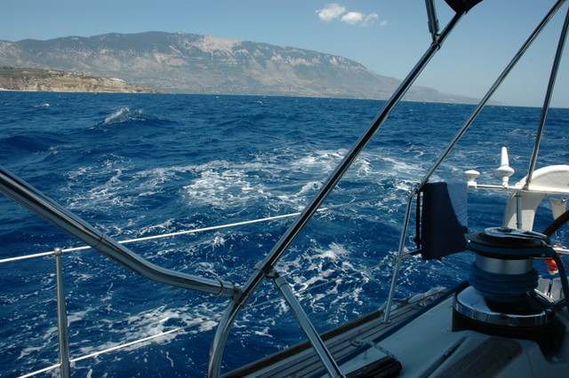 At 10.00 hrs on 13th July we slipped our warps to sail from Zakinthos town to Argostoli, the capital of Kefalonia. We motored north along the east coast of Zakinthos in gorgeous hot sunshine and no wind. When we reached the channel between the islands we were able to sail for a couple of hours NW towards Argostoli. The forecast was for a brisker 15 knots of wind to fill in but as we continued we saw white heads building on the horizon and as it neared the wind increased. The wind got up to 25 knots app which was fine but was on the bow, however, the sea state got unpleasant building to 2m waves and before long we were slamming into unpleasant seas. After a couple of hours we decided to give up and run back to a protected outcrop called Liakas point near Lourdha bay on the south of Kefalonia.