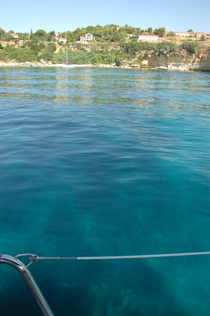 In Greece the wind seems to always increase when the sun goes down, followed shortly afterwards by a stillness before a calm night or it kicks in again. The wind came back but had reduced substantially. The following morning the still water was like looking into a clear, turquoise aquarium— so different.