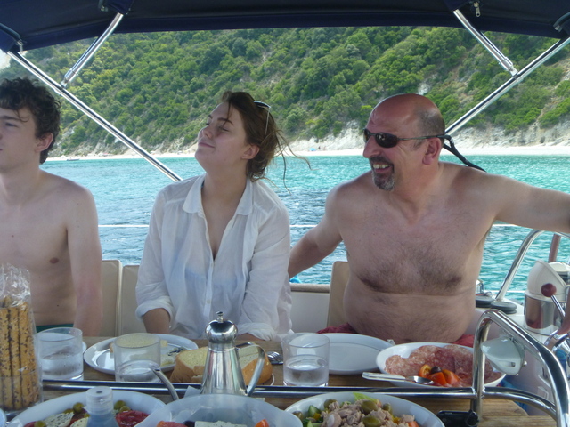 On 22nd July our friends Carol, Pat and children Alex and Imogen arrived. We were waiting for them on the dock at Sami and the taxi dropped them right by the side of the boat.