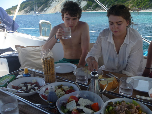 With a flat calm sea and a gentle 7 knots of wind we motor sailed the 9 n miles to an anchorage for lunch called Pera Pigadhi. It is very narrow channel between Ithaca and an islet with about 6m of water, great for swimming. The drop off of the seabed is substantial on either side and so we had lots of anchor chain out. The steep slopes of Ithaca, majestic above the waterline continue their gradient under the sea.