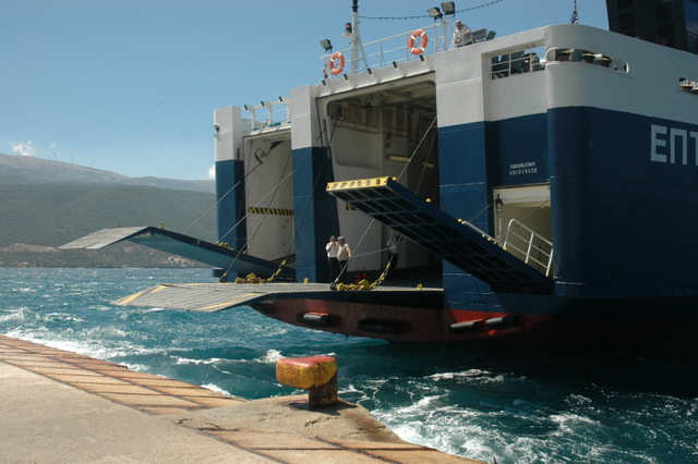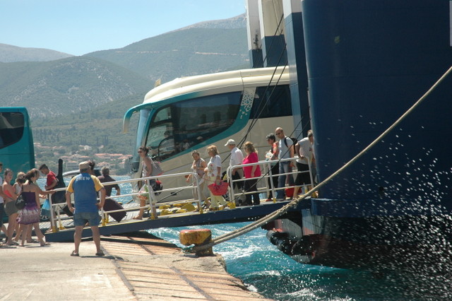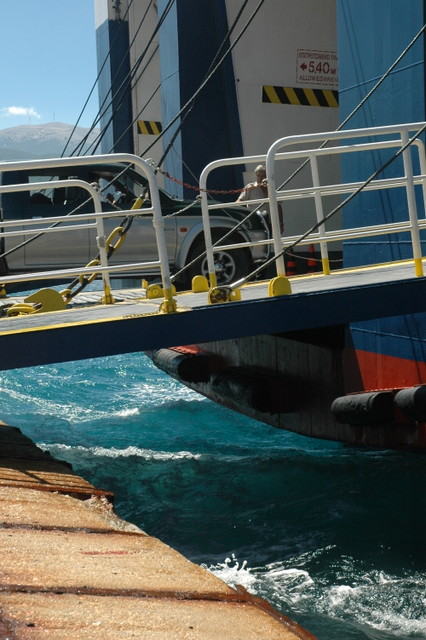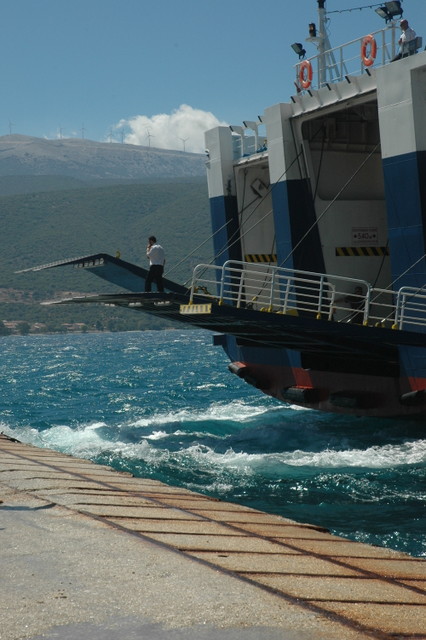 Families, friends are reunited, people hug, take suitcases, jump into cars and disappear into the dust of the traffic. Finally the ferry leaves, lines are slipped from the dock, the ferry speeds away lifting the anchor, a man stands on the plate door until it is lifted and the sea is churned up as the ship heads away.