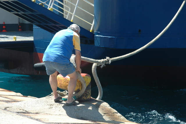 People rush off with parcels to waiting cars, others rush to hand over all sorts of merchandise in various packages—from small to furniture size. The atmosphere becomes more frenzied as people and cars begin boarding whilst other are leaving. The inevitable shouting voices, car horns and port police whistles fill the air as the boarding cars reverse back off the ferry again to let off the ‘imprisoned’ arriving car. Articulated lorries drive up at speed, turning rapidly in between the mayhem and then reverse at alarming pace up the plate ramp and onto the ship ready for driving out at the next port—- a few feet either way and they would end up in the sea.