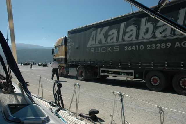 The gathering of people, cars and lorries are a sure sign of an impending arrival. The access road to the ferry runs along the harbour and so only a few feet from the moored yachts.