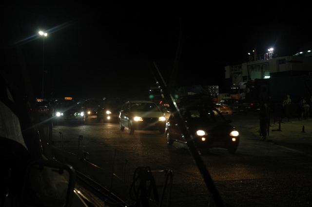 Often before the plate hits the ground, waiting people and motorbikes spill out of the ship. I have seen a car driving off the plate door just as the monkey balls were thrown to the waiting locals who pulled the fine lines until the heavy bowlines reached the quay and were secured— after the car was ashore. The whole activity of exiting cars and lorries has a frenetic speed.