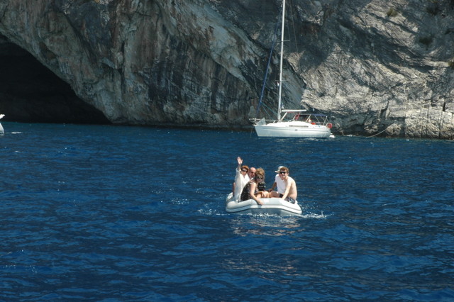 We continued to sail in 12 knots of hot breeze to the Island of Atokos and One House bay, literally a bay with ‘One House’. The wind increased and whistled through the gorge so we decided to anchor and go stern to a cutting in the cliff for lunch. The steep rocks created an aquarian of transparent water and fish.