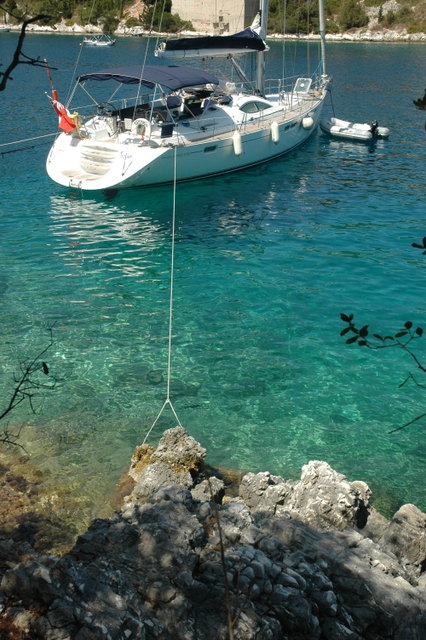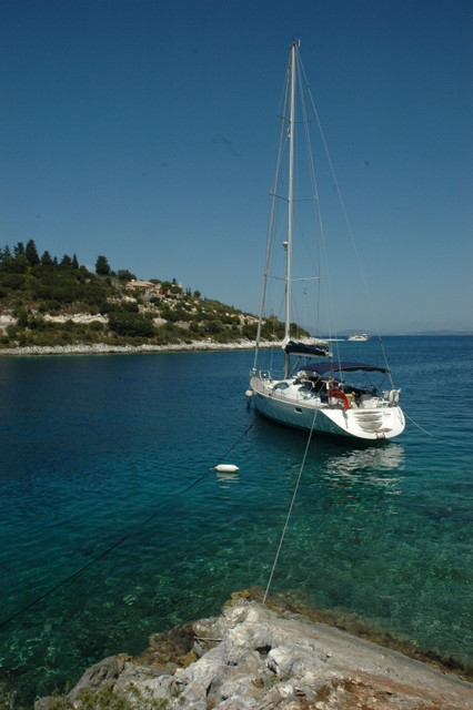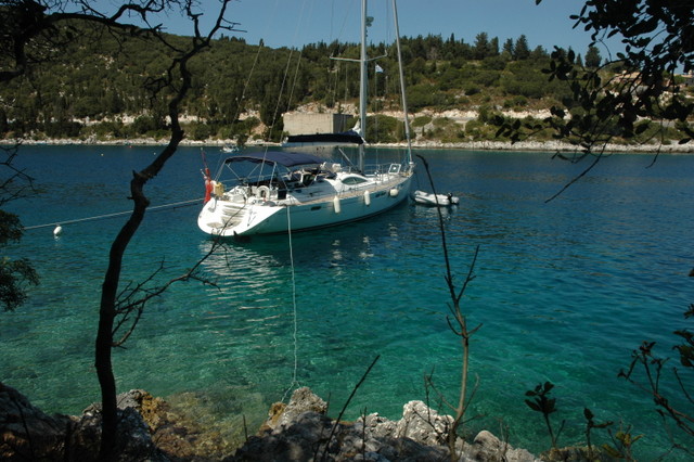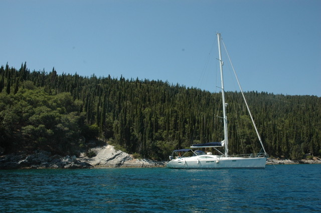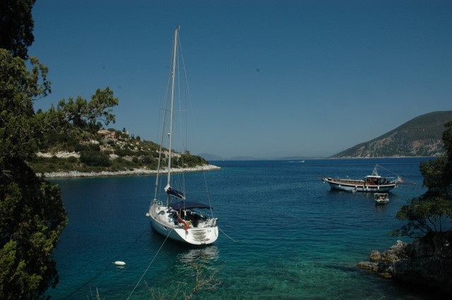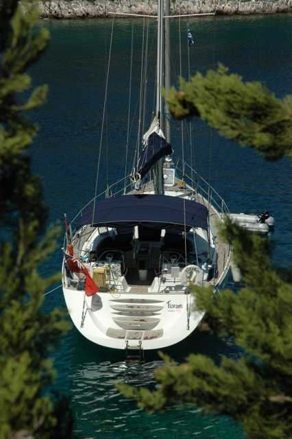 This gave us a great photo opportunity looking down onto Tioram sitting in the beautiful bay. The boat looks dramatically close to the shore and in the past we would have bulked at the idea of mooring close to a coastline. However, in the Ionian the shorelines are very deep right up to a few metres away. So with plenty of anchor chain laid at the bow and the choice of position with the wind on a stern or very light cross winds we safely sit in plenty of depth with our own private swimming pool at our stern.