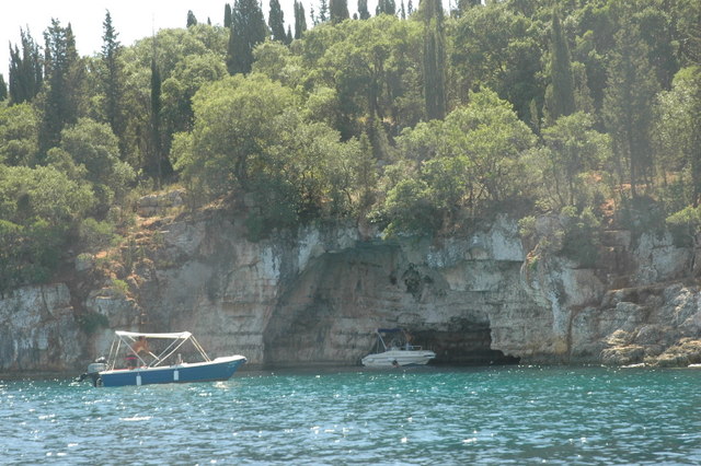Ormos Foki bay is a tiny inlet just south of Fiskardho. Here you have to drop an anchor and attach mooring lines stern to the rocks or shoreline. The tranquil bay has lovely clear water for swimming and a large cave which is easy to swim inside and get out of the water onto a small internal beach. The passage ways lead through the huge cathedral-like cave and out into the daylight on the hillside directly behind where we were moored.