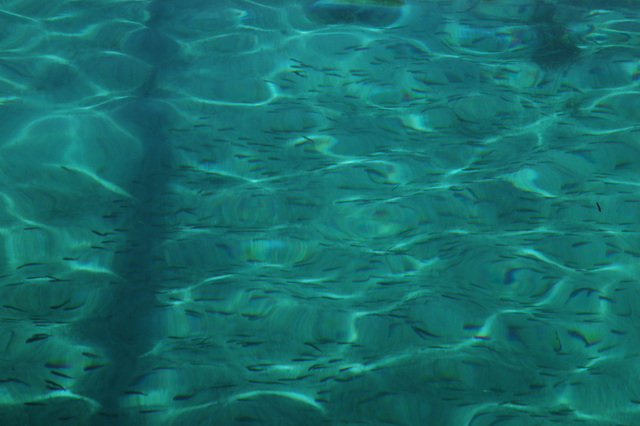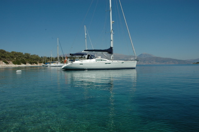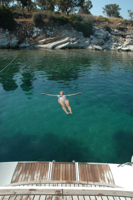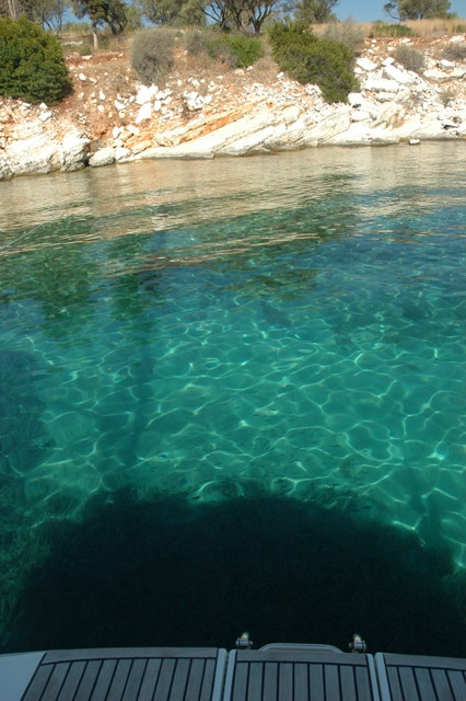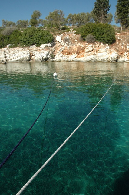 The lovely simple bay of Port Atheni , the shoreline and our private swimming ‘pool’ with fish behind the boat.