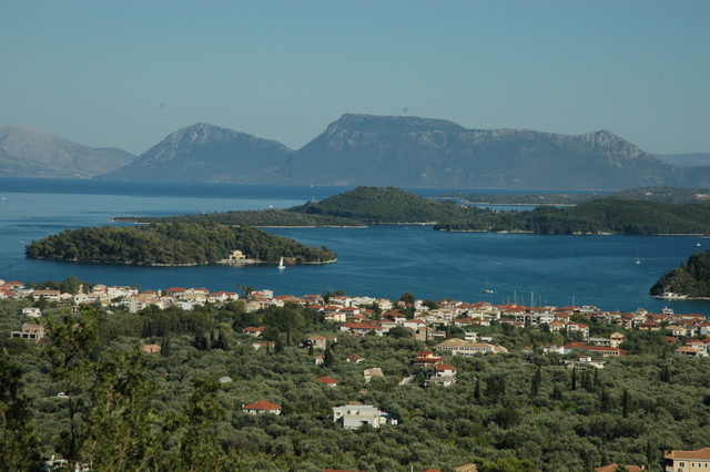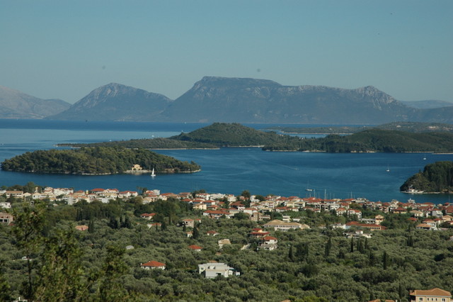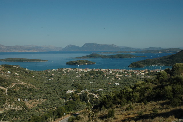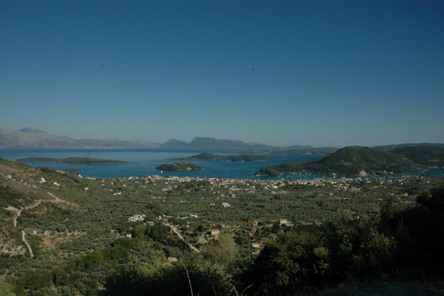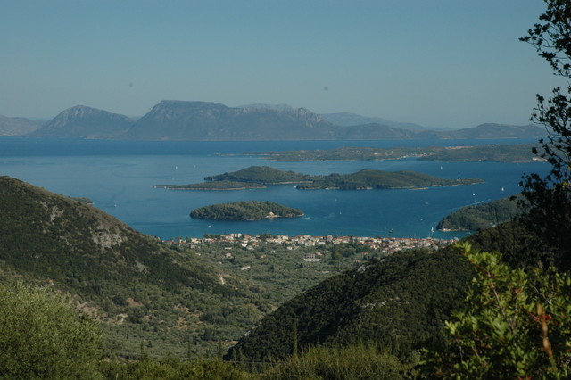 From the mountains looking down to the right over Nidri, the large natural harbour of Vlycho