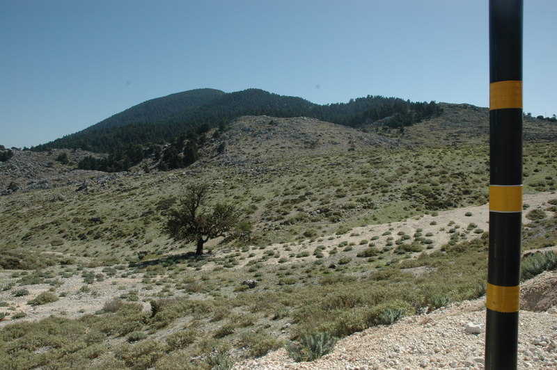 The vast mountain of Mt. Ainos has a height of 1,628M is the tallest mountain in the Ionian islands. The winding road to the top looks down into our favourite valley of Gerassimus and to the Monastery and vineyards. As we climbed the late season air turned cooler with altitude, the pine forests and cypress trees shading the road. The recent heavy 3 days of rain had turned the countryside into a spring landscape with fine bright green shoots of grass and wild flowers—–very unlike Autumn.We scootered through small plateaus cultivated by people, long passed. The craggy rocks, green hillside and slopes reminded us so much of the highlands of Scotland, complete with snow poles on the edge of the tiny road