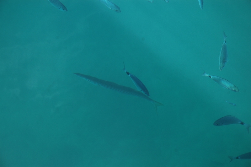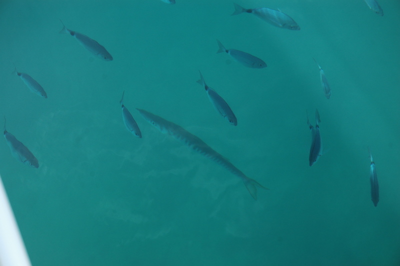Whilst we were feeding the fish on the surface, a barracuda came prowling from the deep and tried to catch a meal—- you can see it , long thin and stripey——– the only one we have seen in the med, thankfully, not like the ones that used to come close to us in the Caribbean which were much larger and had me doing Olympic record swims back to the boat !!!