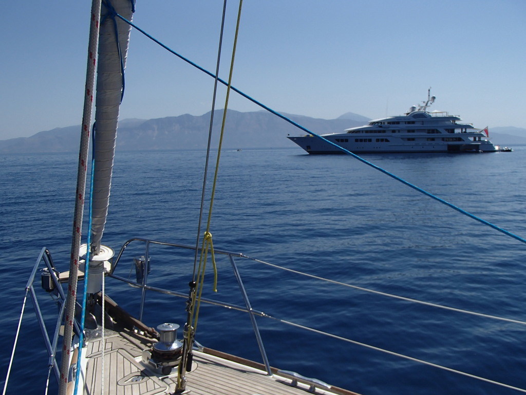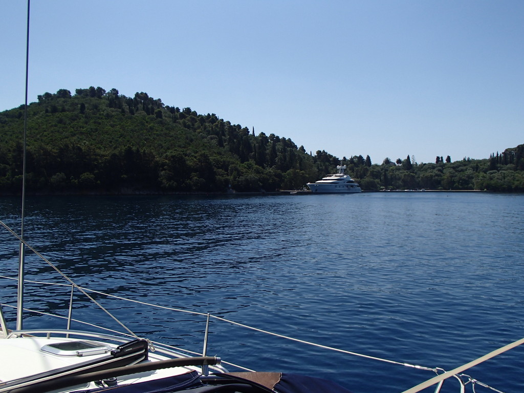 We motored through a small channel between the island of Skorpios and skorpidhi, on the quay was a large superyacht where once the Onassis motor yacht ‘Christina’ was moored. Further in the channel we saw another large motor superyacht anchored near the island. We wondered who was visiting, as there was a security guy patrolling the shoreline.