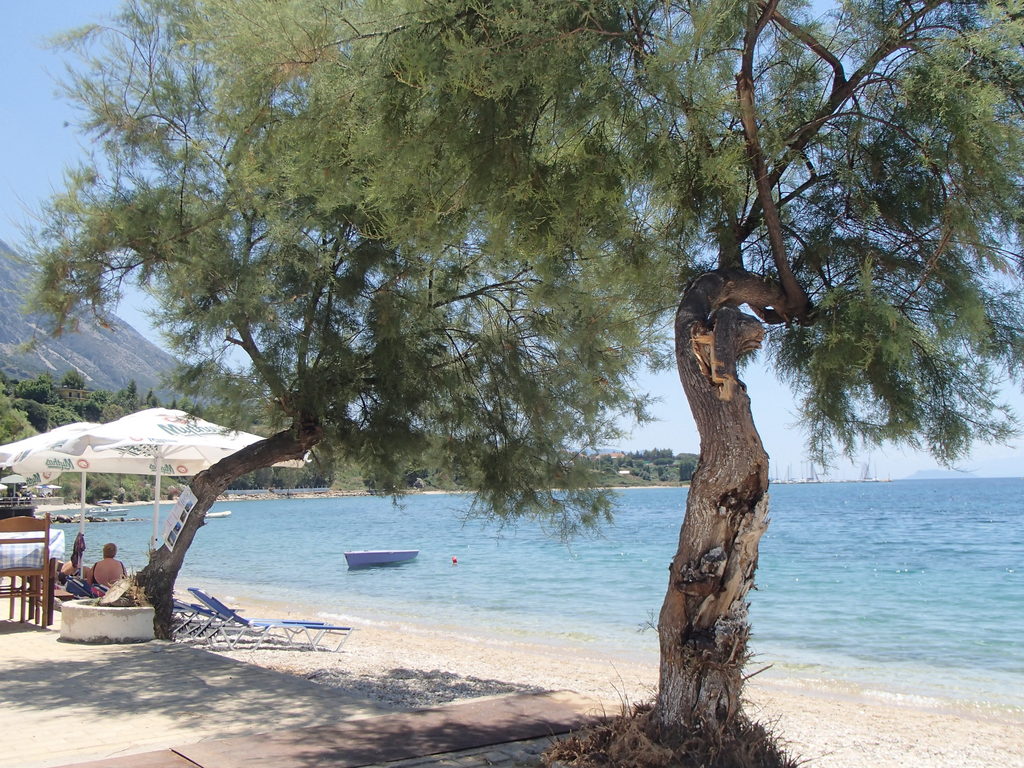 Palairos harbour- Tioram anchored in distance, pebbled beach and Taverna ashore, Palairos.