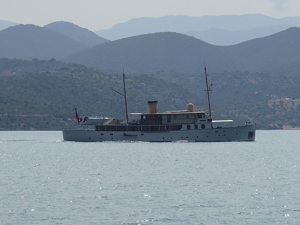 The following morning, 28th a beautiful motor gentleman’s yacht steamed by us at anchor. Tony was convinced the yacht was the one used in Mama Mia. The shot of the film when Meryl Streep and girls dance all over the yacht with coloured scarves and fabric flowing in the breeze. The yacht has a fairly unique shape and funnels. In a documentary about the making of the film the producer said that the yacht which had been chartered for the filming was unable to arrive for some reason……bet the owner has never forgotten that……instead the motor yacht chartered by Bjon from Abba for his own use, was then used in the filming instead. It passed us and went across the bay from Ligia , anchoring near the shore in a quiet area away from other yachts……..so who was on board we wonder, looking for privacy ???
