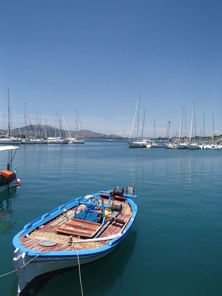 We lifted anchor at 11.15 hrs. heading east trickling along the shore of the Greek mainland on the genoa, making de-sal water, finally arriving at 13.45hrs in a bay called Varkho. It is a nice open bay with a beach and tiny beach bar.