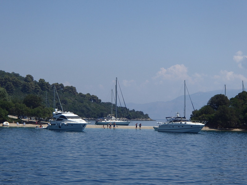 In very light wind we motored up the coast of Levkas, visiting Dessimou bay before heading NE past the Island of Meganisi and on to the Onassis Island of Skorpios.